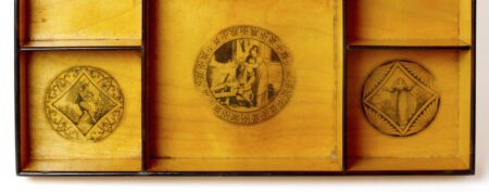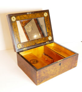 Biedermeier Schatulle mit Original Spiegel, Thuja Wurzelmaser, Spiegelrahmen an den Ecken jeweils mit einem Messing-Medaillon. Zweilagige Inneneinrichtung mit Schublade, Geheimschublade, Fächern und fünf Umdrucken in Form von Medaillons mit Biedermeier-Motiven.