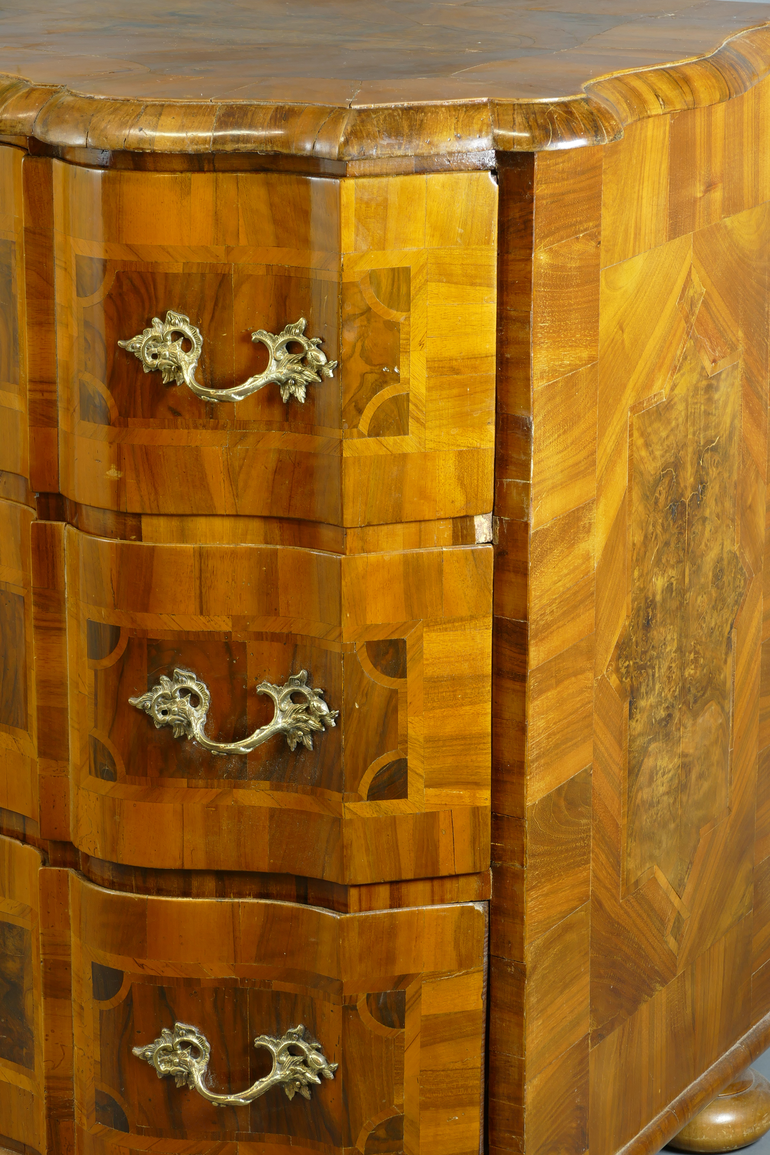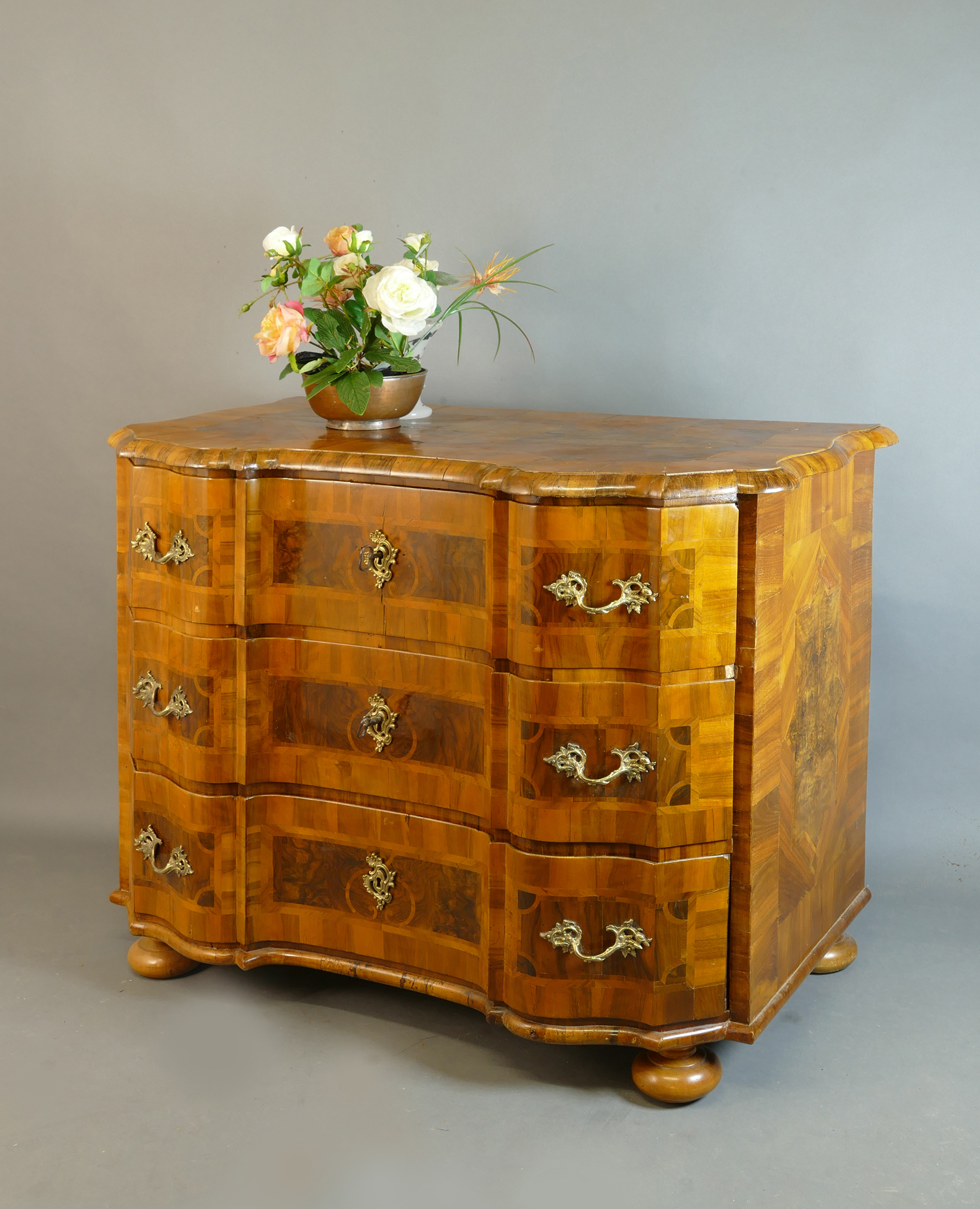 Nuss und Nussmaser auf Tanne in der Platte gespiegelt furniert. Bandeinlagen in Zwetschge und Buchsbaum. Front leicht konkav-konvex geschweift. Schubladen mit in sich verschlungenen Bandelwerkeinlagen. Gequetschte Kugelfüße. Originale Beschläge und Schlösser.