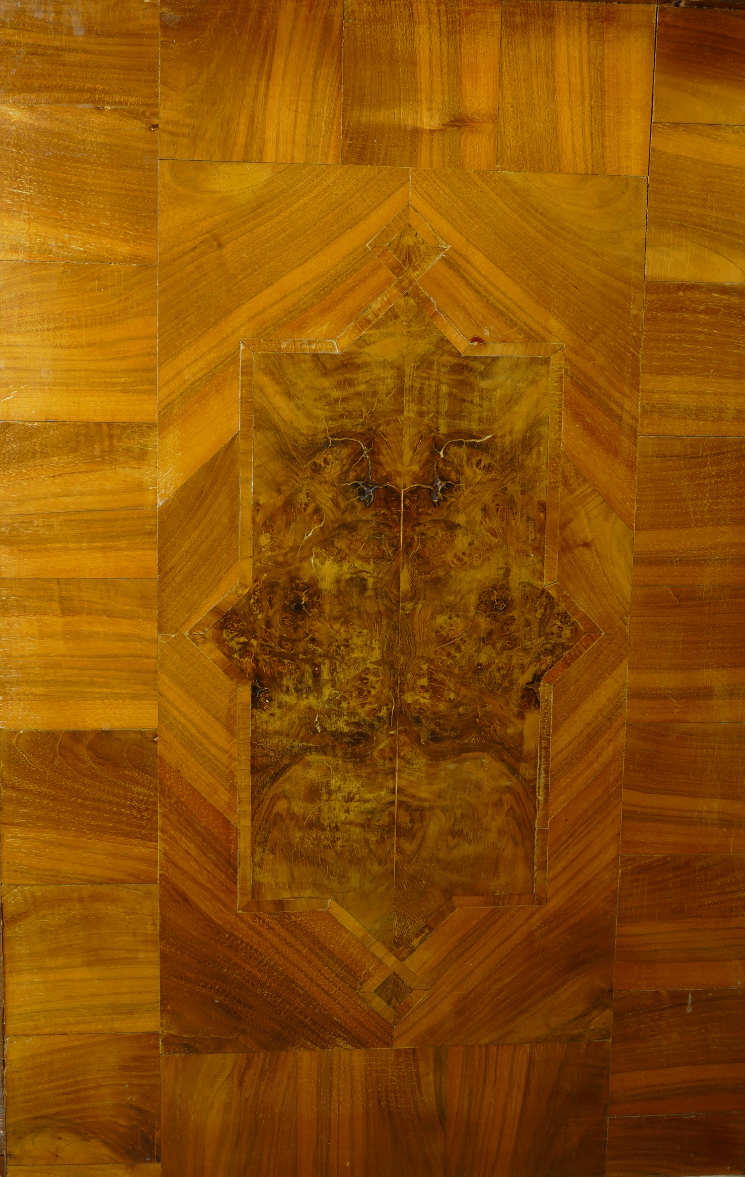 Nuss und Nussmaser auf Tanne furniert. Bandeinlagen in Zwetschge und Buchsbaum. Konkav-konvex geschwungene Front. Querfurnierte Abschlüsse. Originale Beschläge, Schlösser und Schlüssel.
