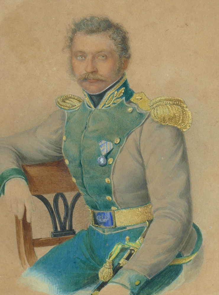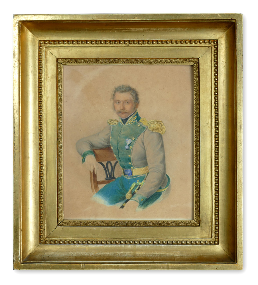 Franz Xaver Nachtmann: Portrait des Revierförsters Maximilian Schenk d. Älteren, um 1820/1825. Außergewöhnlich fein gearbeitetes Aquarell aus der Biedermeierzeit mit Glanzpunkten in Goldfarbe. Mehrfach profilierter, blatttvergoldeter Originalrahmen.