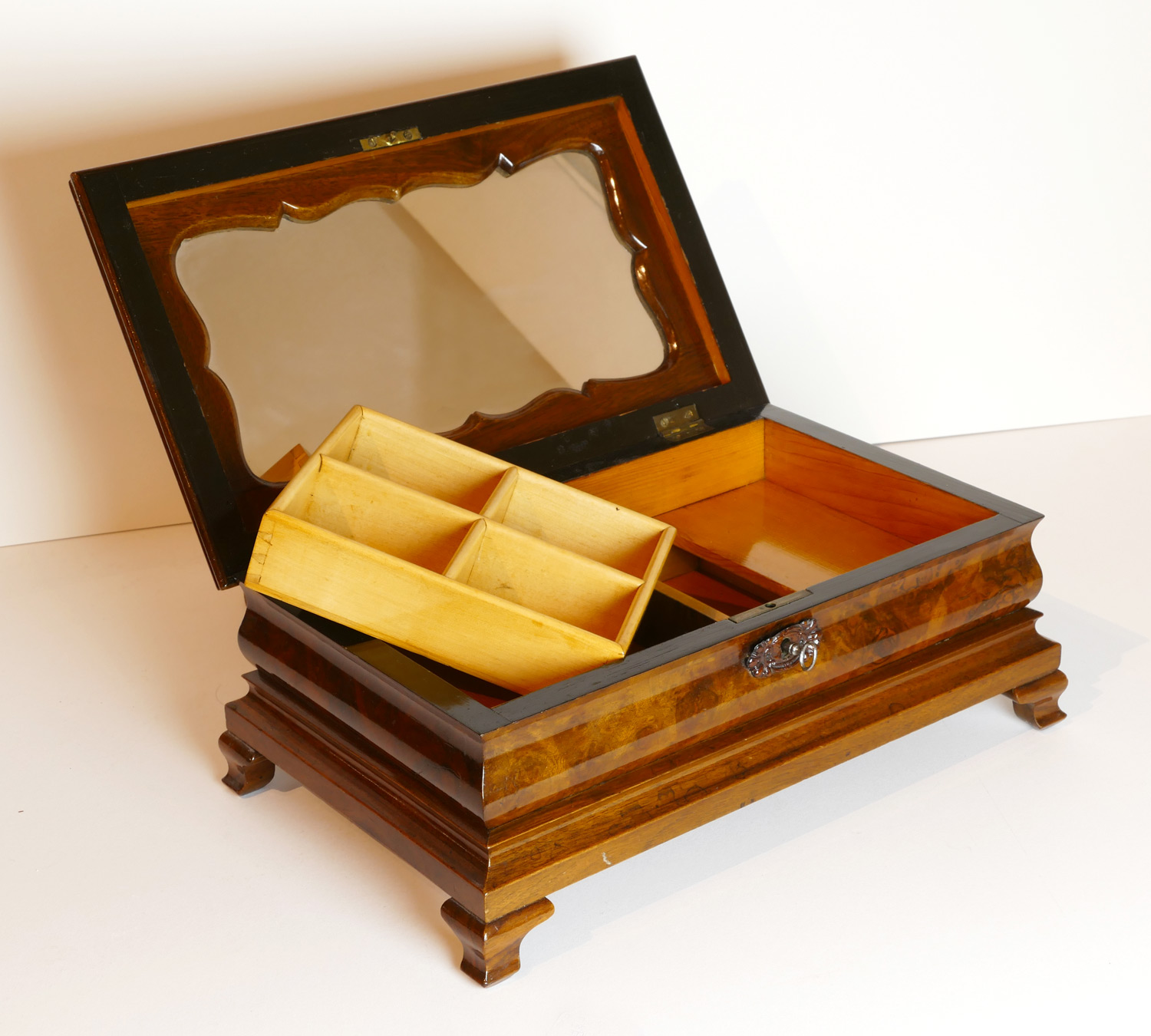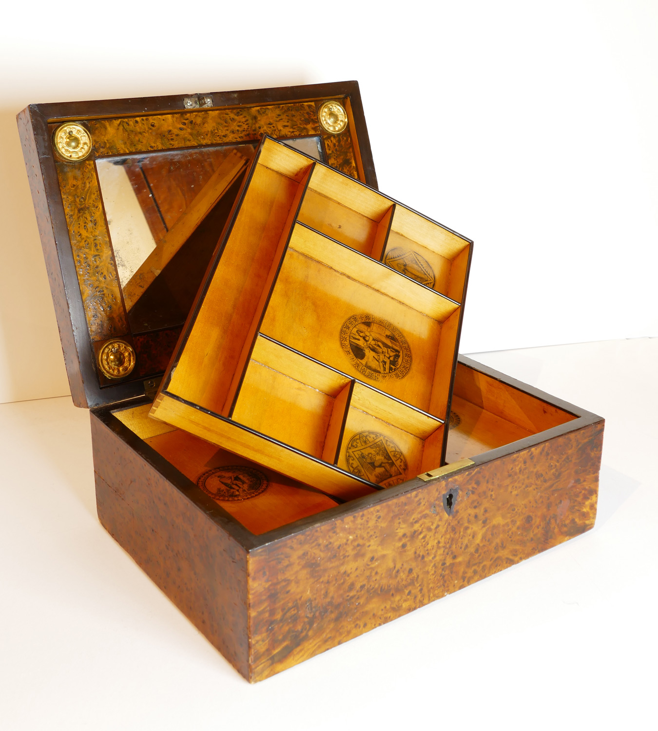 Biedermeier Schatulle mit Original Spiegel, Thuja Wurzelmaser, Spiegelrahmen an den Ecken jeweils mit einem Messing-Medaillon. Zweilagige Inneneinrichtung mit Schublade, Geheimschublade, Fächern und fünf Umdrucken in Form von Medaillons mit Biedermeier-Motiven.