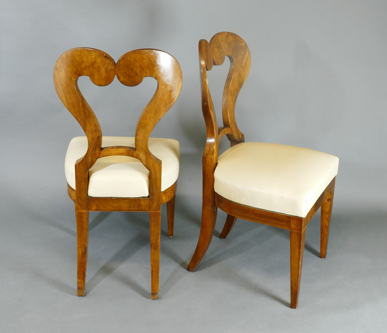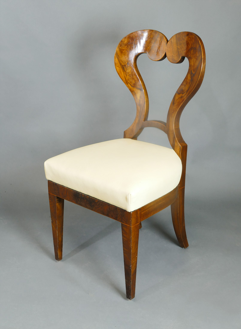 6-er Satz Wiener Biedermeier-Stühle, Nuss gespiegelt furniert mit Fadeneinlagen, vorne konische Beine, hinten Säbelbeine, nach Hinten geschweifte Zarge, herausnehmbare Sitzpolster, in Voluten zusammenlaufende Rückenlehne.