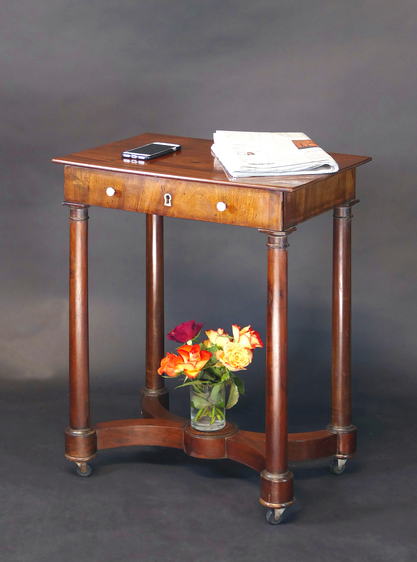 Mahagoni auf Eiche furniert, Zargenschub querfurniert, Griffe und Schüsselbuchse aus Messing, Tischbeine als dorische Vollsäulen mit Basis und Kapitell ausgebildet, Fußverstrebung querfurniert, mit zentralem Kreis und geschwungenen seitlichen Bögen, auf Rollen ruhend, originales Schloss mit Schlüssel.