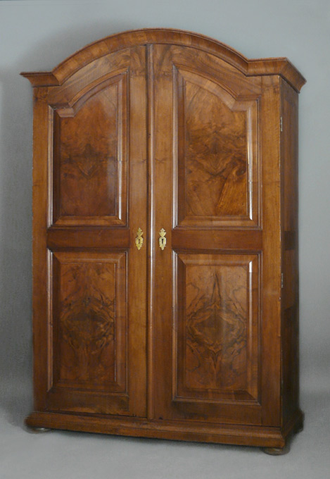 In der Front Nuss auf Nuss gespiegelt furniert, in den Türen Kassettenbauweise, Gesims querfurniert, Abschlussleiste konkav geschweift. Original Schloss und Schlüssel, original Schiebe-/Verschlussmechanik, gequetschte Kugelfüße, Segmentbauweise, leicht zerlegbar.