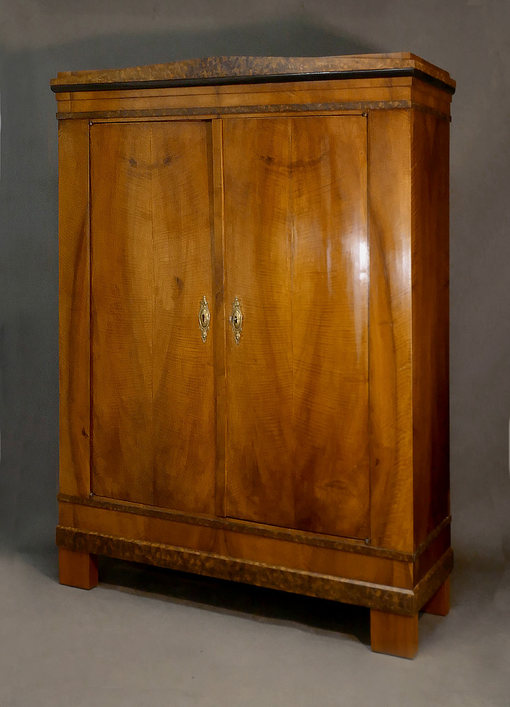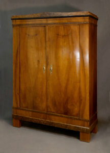 Nuss auf Fichte furniert, Segmentbauweise, oberer und unterer Abschluss gespiegelt und quer furniert, Seiten gespiegelt furniert, Pfostenbeine.Maße: Höhe 192 cm, Breite 160 cm, Tiefe 58 cm (innen 52 cm)