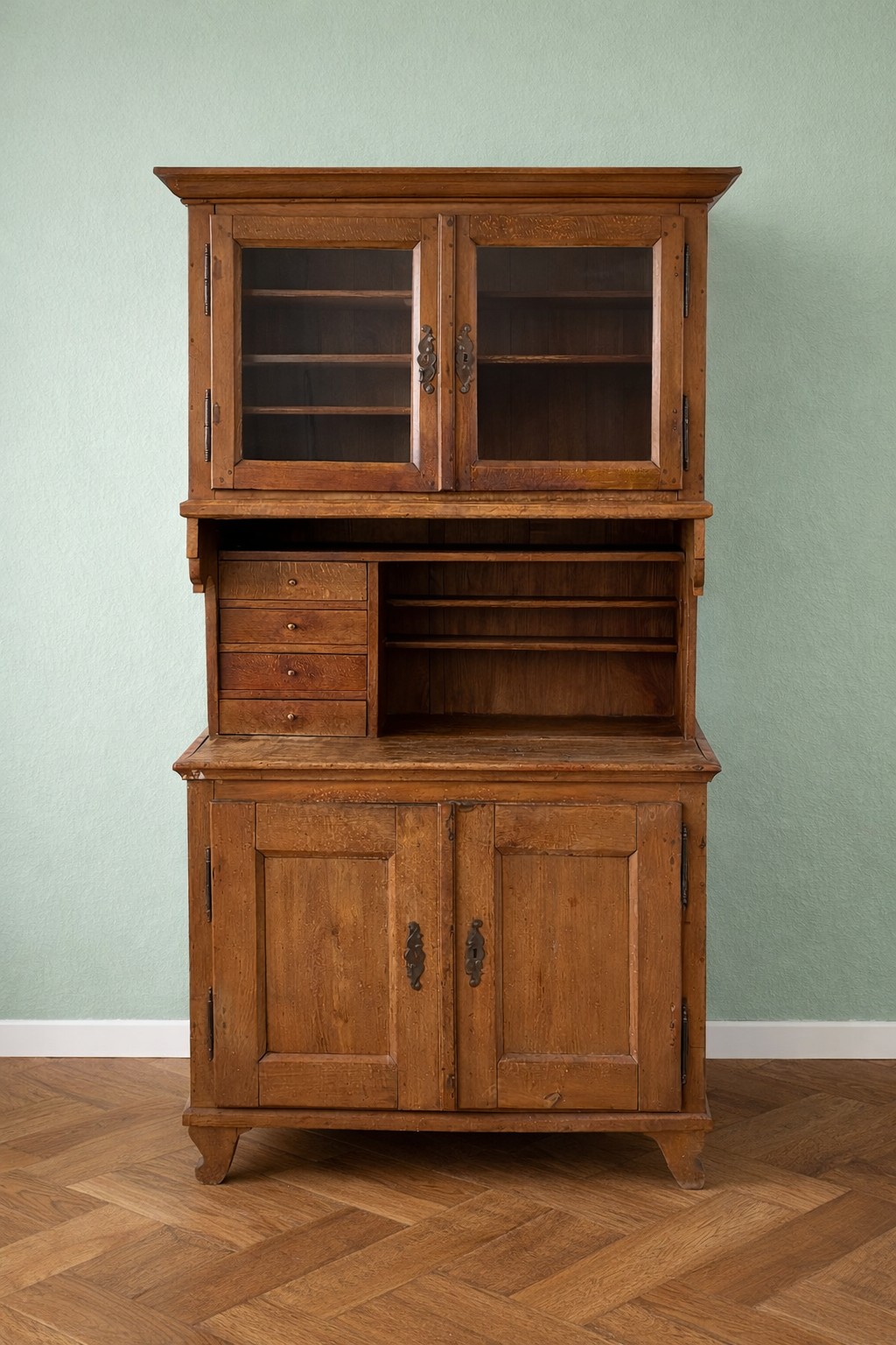 Buche massiv, oben Vitrinenteil mit zwei Glastüren und bis zu vier Ablagefächern pro Seite, darunter links vier kleine Schubladen für Besteck und Küchenutensilien sowie weitere Ablagefächer. Abstellfläche auf Arbeitshöhe, im unteren Bereich als zweitüriger Halbschrank gestaltet, originale Beschläge, geschwungen gestaltete Füße