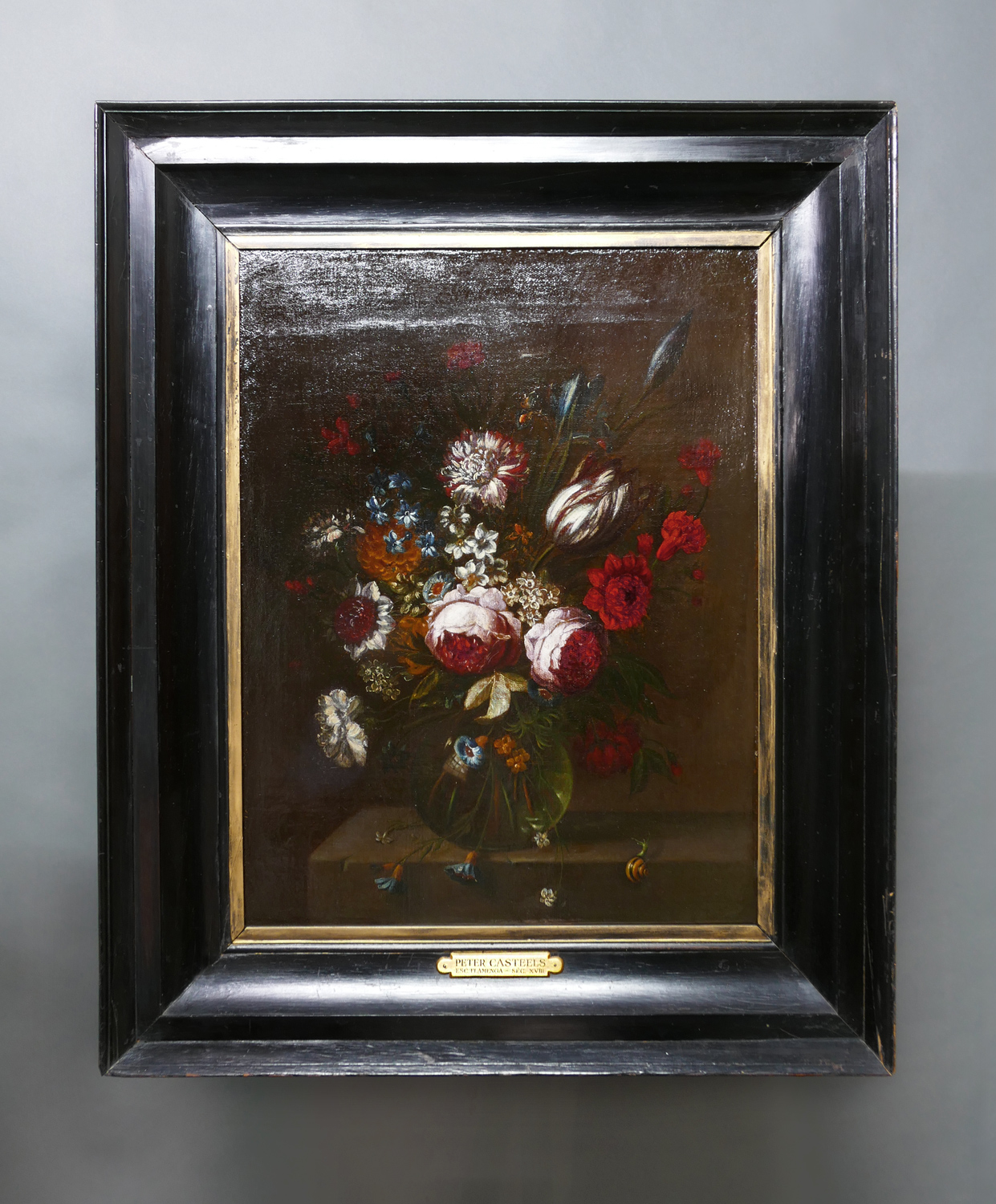 Gemälde, Öl auf Leinwand und Keilrahmen des flämischen Malers Peter Casteels mit einem bunten Strauß verschiedener Blumen wie Rosen und Tulpen. Sehr fein und detailliert gemalt. Rechts unterhalb des Straußes befindet sich eine kleine, an der Tischkante emporkriechende Schnecke. Ebonisierter Rahmen mit vergoldeter Einlageleiste.