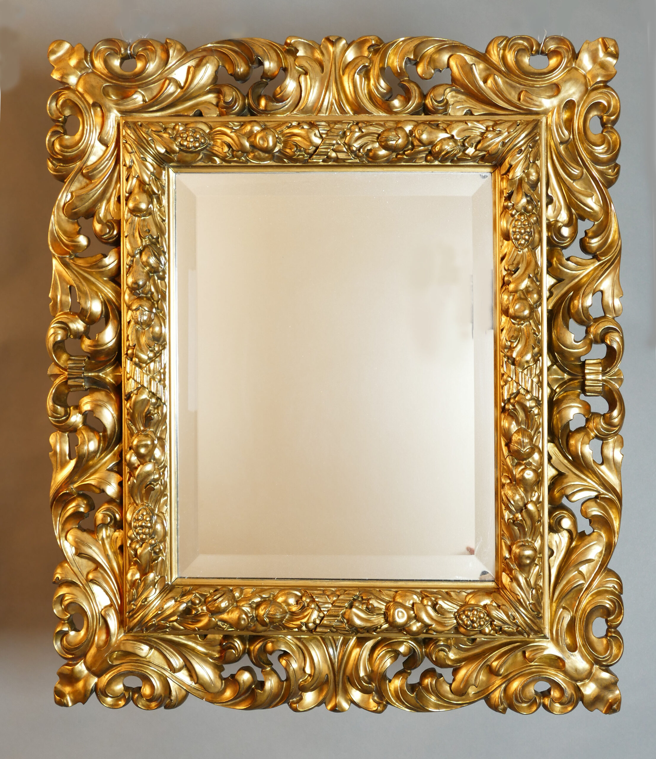 Geschnitzt und blattvergoldet, geätztes Glas in der Randleiste, Vergoldung über rotem Bolus, Maße: 49 cm x 57 cm (außen), 32,5 cm x 41 cm (innen), Objekt: BA-712 Anfrage